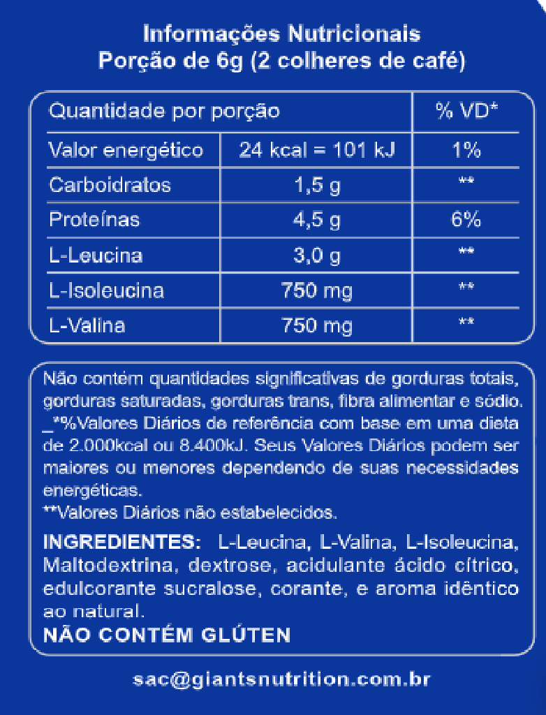 Ingredientes: L-leucina, L-Valina, L-Isoleucina (*Acréscimo de: maltodextrina, dextrose, acidulante ácido cítrico e edulcorante sucralose, de acordo com sabor).